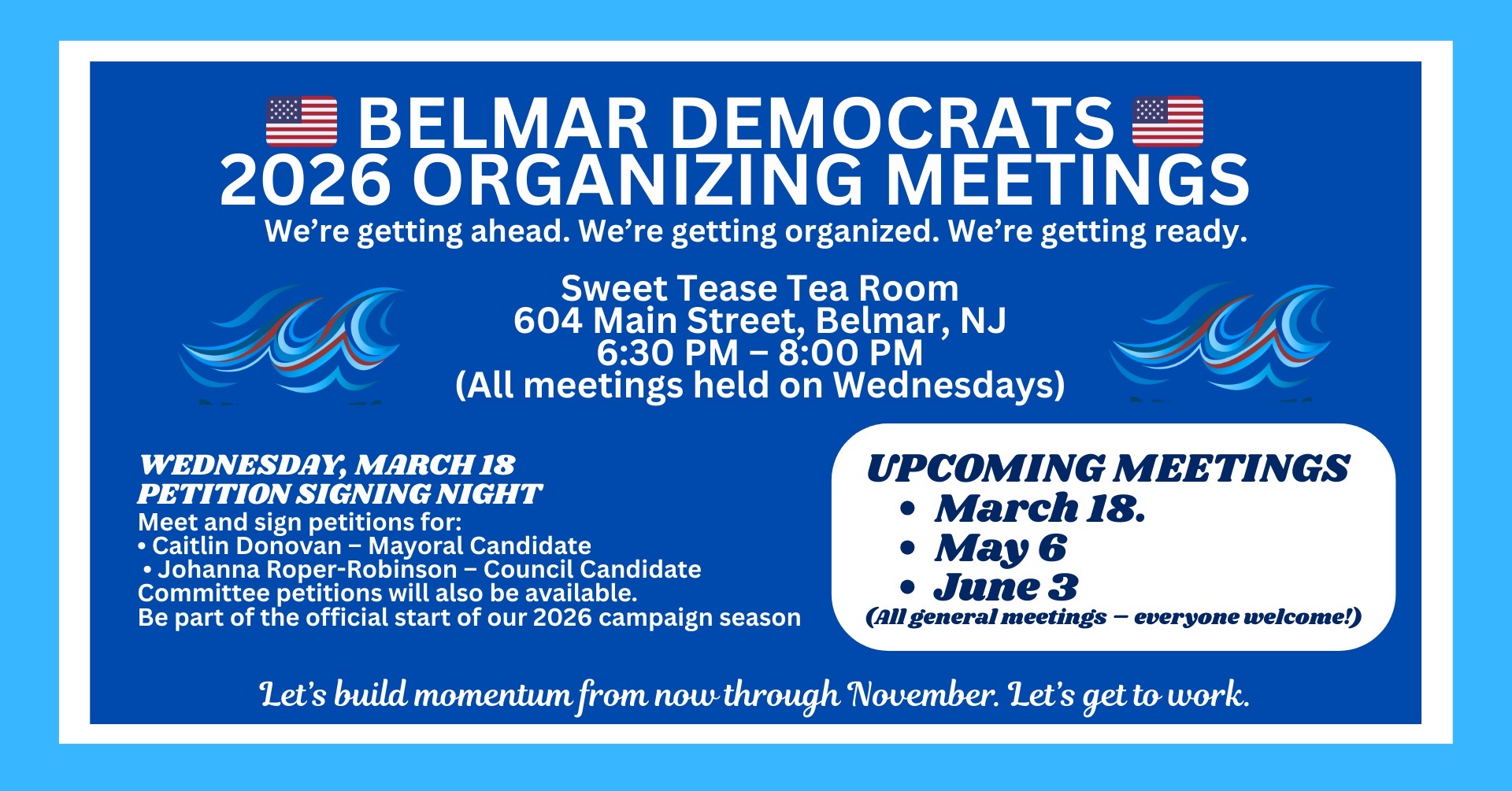 You're invited to join the Belmar Democrats for their 2026 Organizing Meetings at the Sweet Tease Tea Room (604 Main St, Belmar, NJ 07719) from 6:30 pm - 8:00 pm.