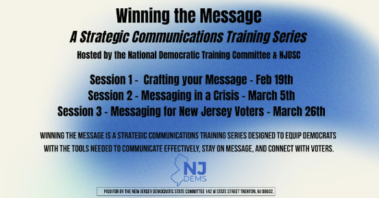 Winning the Message is a strategic communications training series led by the National Democratic Training Committee and NJDSC, designed to equip participants with the tools needed to communicate effectively, stay on message, and connect with voters.
