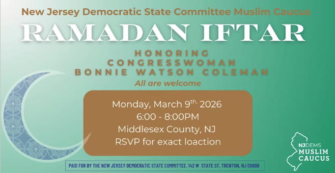 Join the New Jersey Democratic State Committee Muslim Caucus for a special Ramadan Iftar as we gather in community with Congresswoman Bonnie Watson Coleman